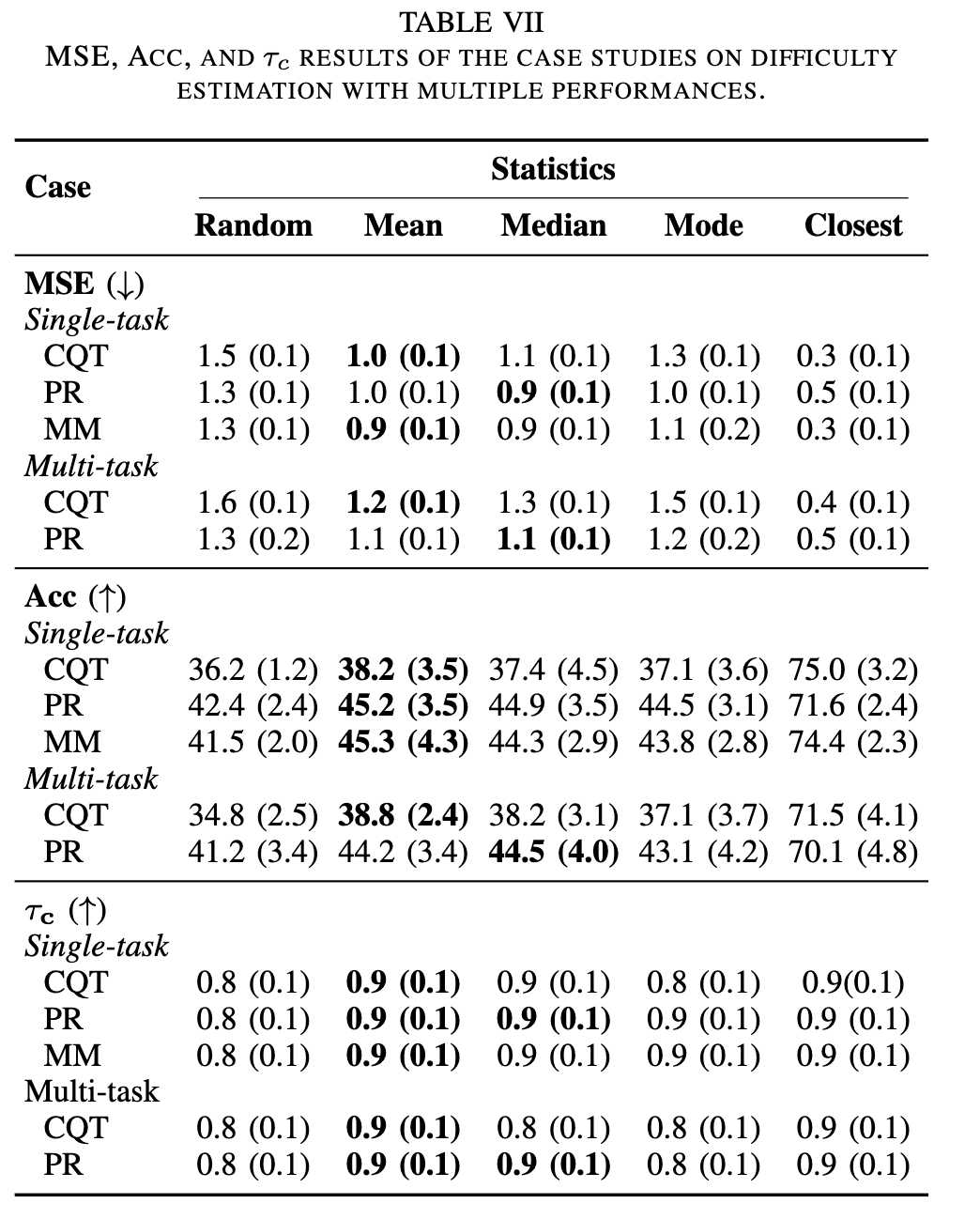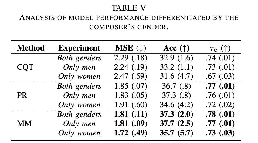 * MM 模型在混合性别数据上表现最佳,但测试女性作曲家作品时性能显著下降。尽管 MSE 较低,但 MSE 和准确率的标准差显著较高。这暗示模型对女性作曲家作品的预测在粗粒度上与真实值接近,但在细粒度上存在偏差。这可能源于音乐特征的固有差异或难度标注中存在的潜在偏见。